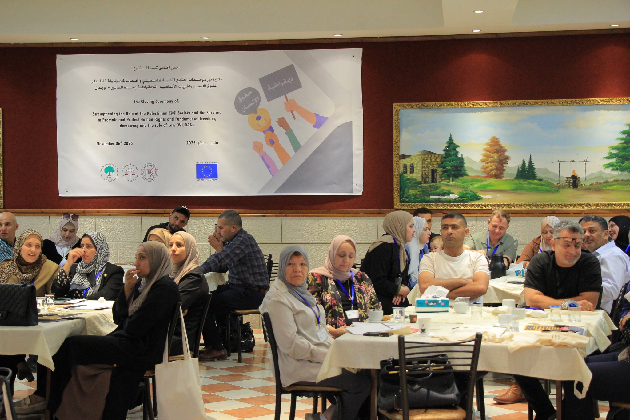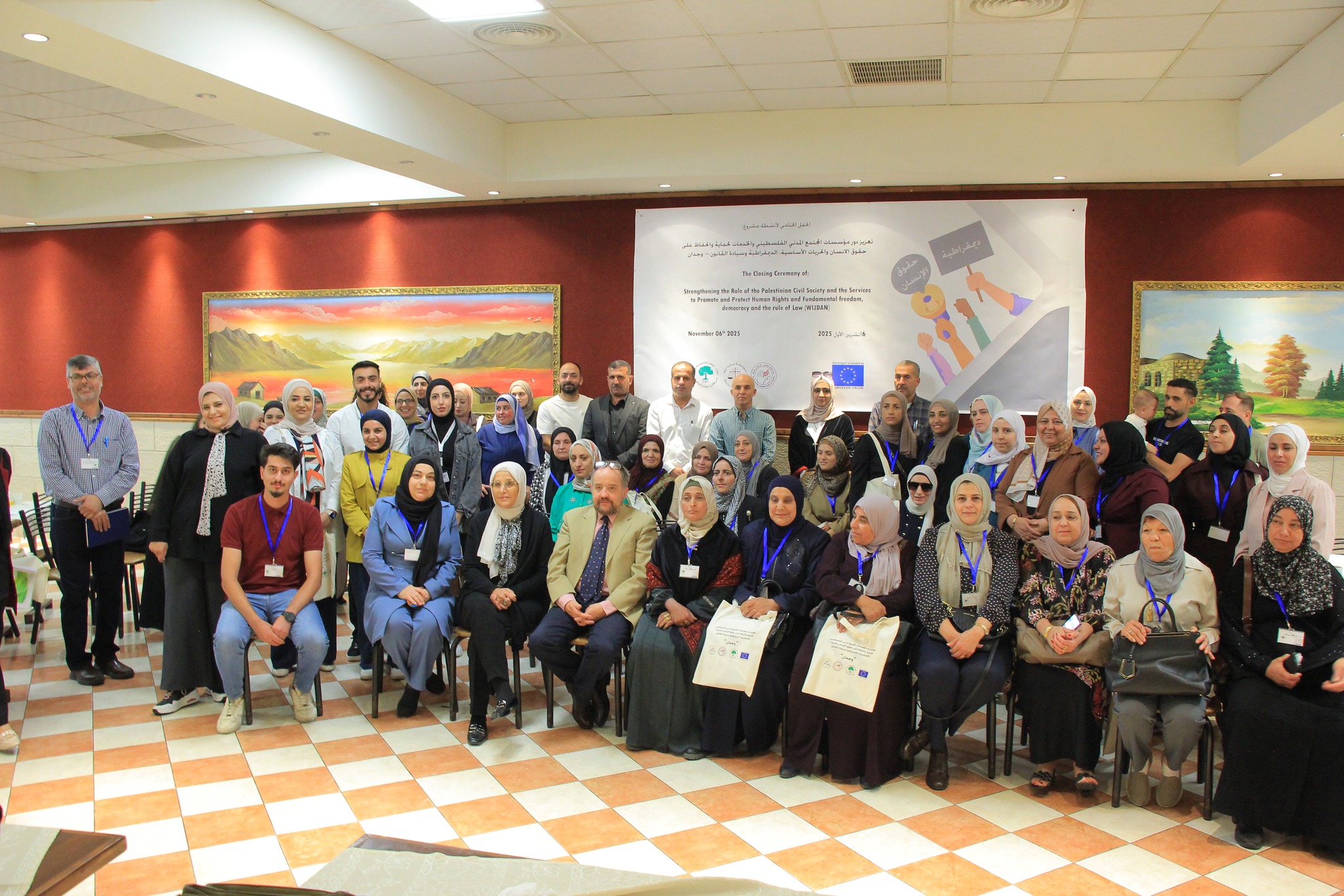 In partnership with the Psycho-Social Counseling Center for Women (PSCCW), the Land Research Center (LRC), and the Society of St. Yves – Catholic Center for Human Rights, the closing ceremony for the project titled “Strengthening the Role of Palestinian Civil Society and Services to Promote and Protect Human Rights, Fundamental Freedoms, Democracy, and the Rule of Law (WIJDAN)” was held on October 16, 2025.